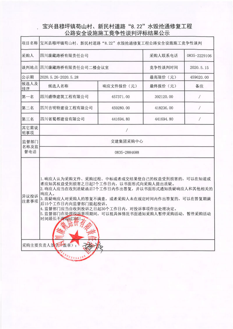 四川康藏路橋有限責任公司寶興縣穆坪鎮(zhèn)茍山村、新民村道路“8.22”水毀搶通修復工程公路安全設施施工競爭性談判評標結(jié)果公示
