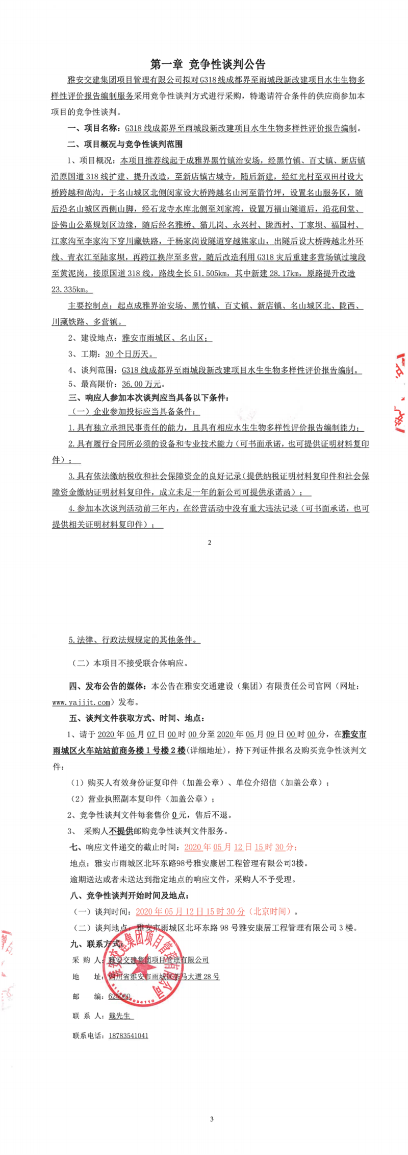 雅安交建集團(tuán)項目管理有限公司G318線成都界至雨城段新改建項目水生生物多樣性評價報告編制競爭性談判(第二次)公告