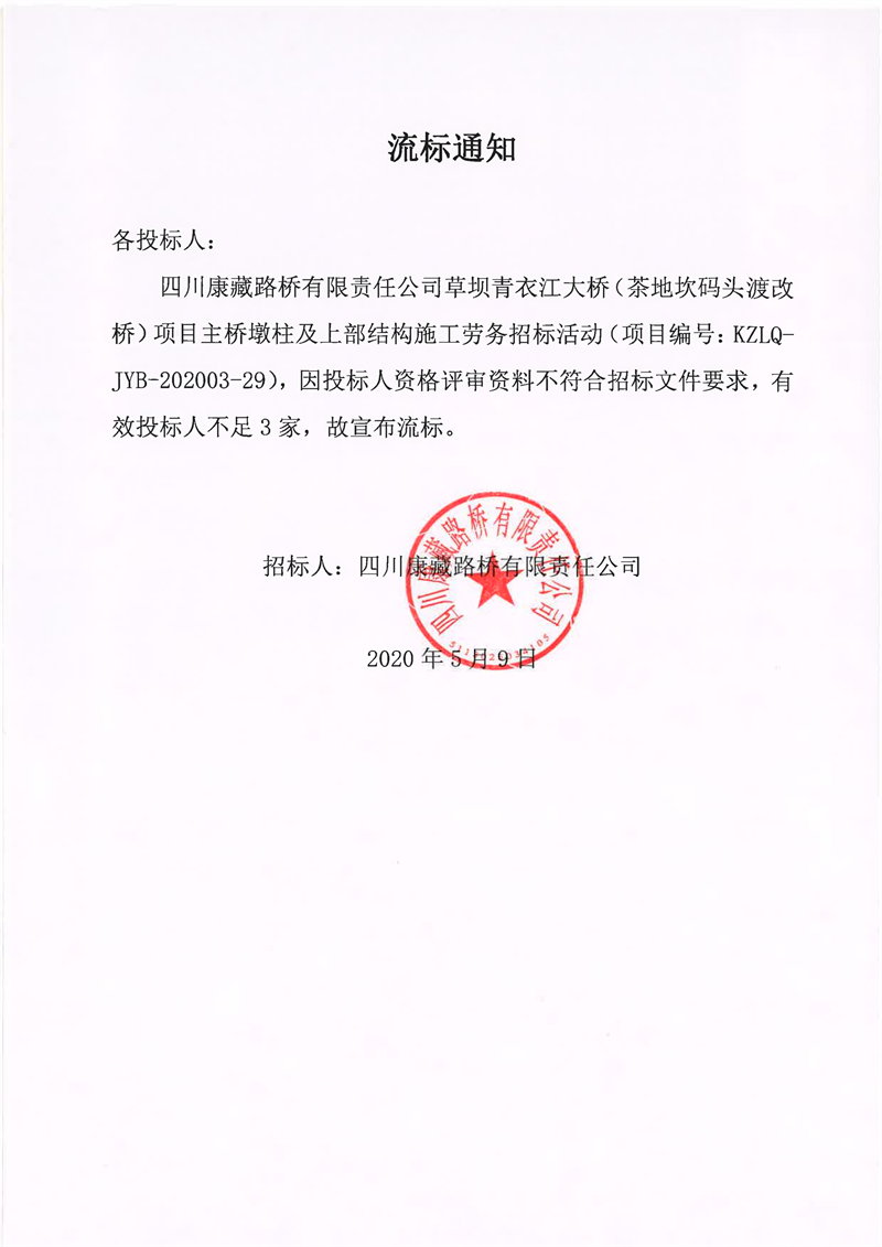四川康藏路橋有限責(zé)任公司草壩青衣江大橋(茶地坎碼頭渡改橋)項(xiàng)目主橋墩柱及上部結(jié)構(gòu)施工勞務(wù)流標(biāo)通知