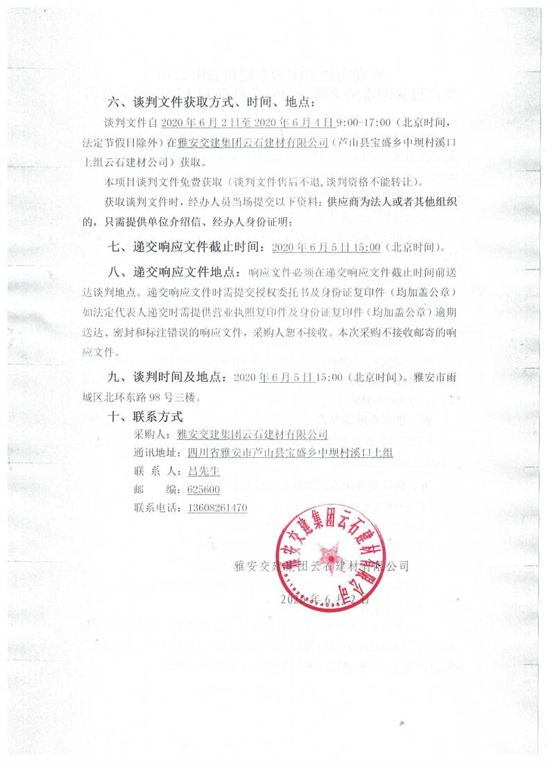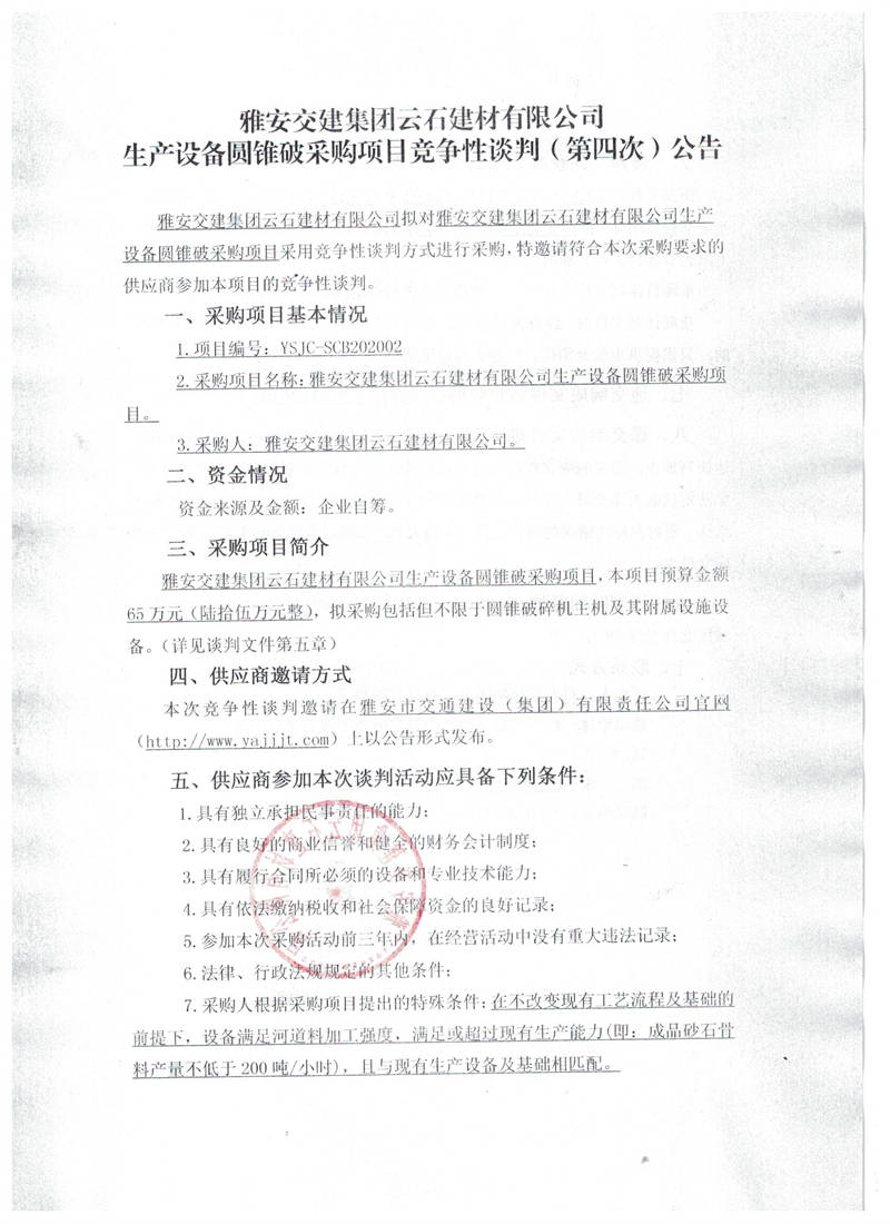 雅安交建集團云石建材有限公司生產設備圓錐破采購項目競爭性談判(第四次)公告