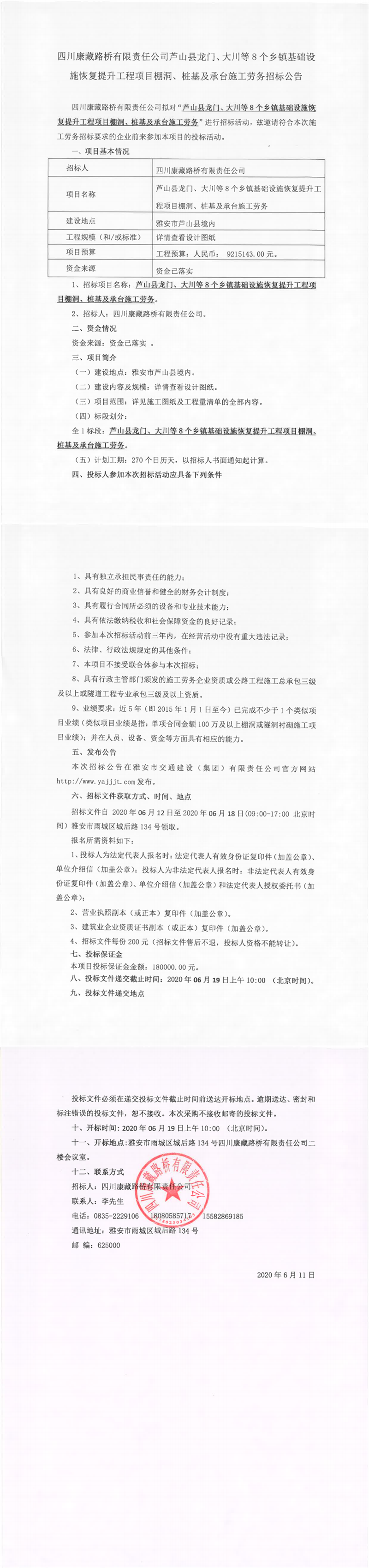 四川康藏路橋有限責(zé)任公司蘆山縣龍門、大川等8個(gè)鄉(xiāng)鎮(zhèn)基礎(chǔ)設(shè)施恢復(fù)提升工程項(xiàng)目棚洞、樁基及承臺(tái)施工勞務(wù)招標(biāo)公告