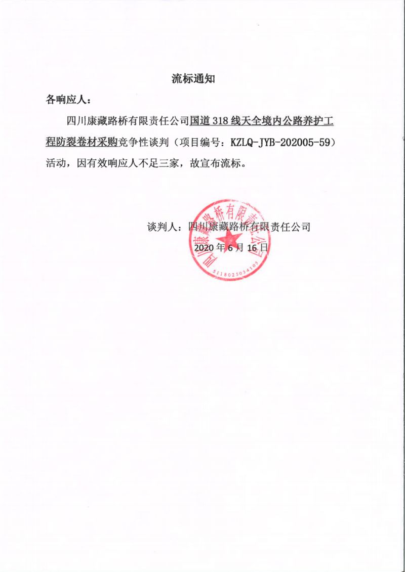 四川康藏路橋有限責(zé)任公司國(guó)道318線天全境內(nèi)公路養(yǎng)護(hù)工程防裂卷材采購(gòu)流標(biāo)通知