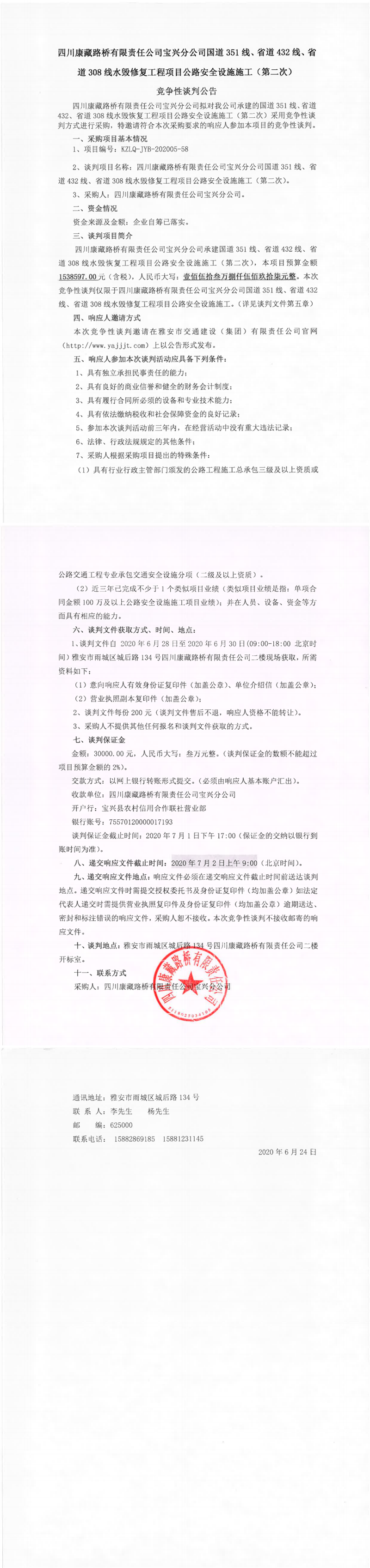 四川康藏路橋有限責(zé)任公司寶興分公司國道351線、省道432線、省道308線水毀修復(fù)工程項(xiàng)目公路安全設(shè)施施工(第二次)競(jìng)爭(zhēng)性談判公告