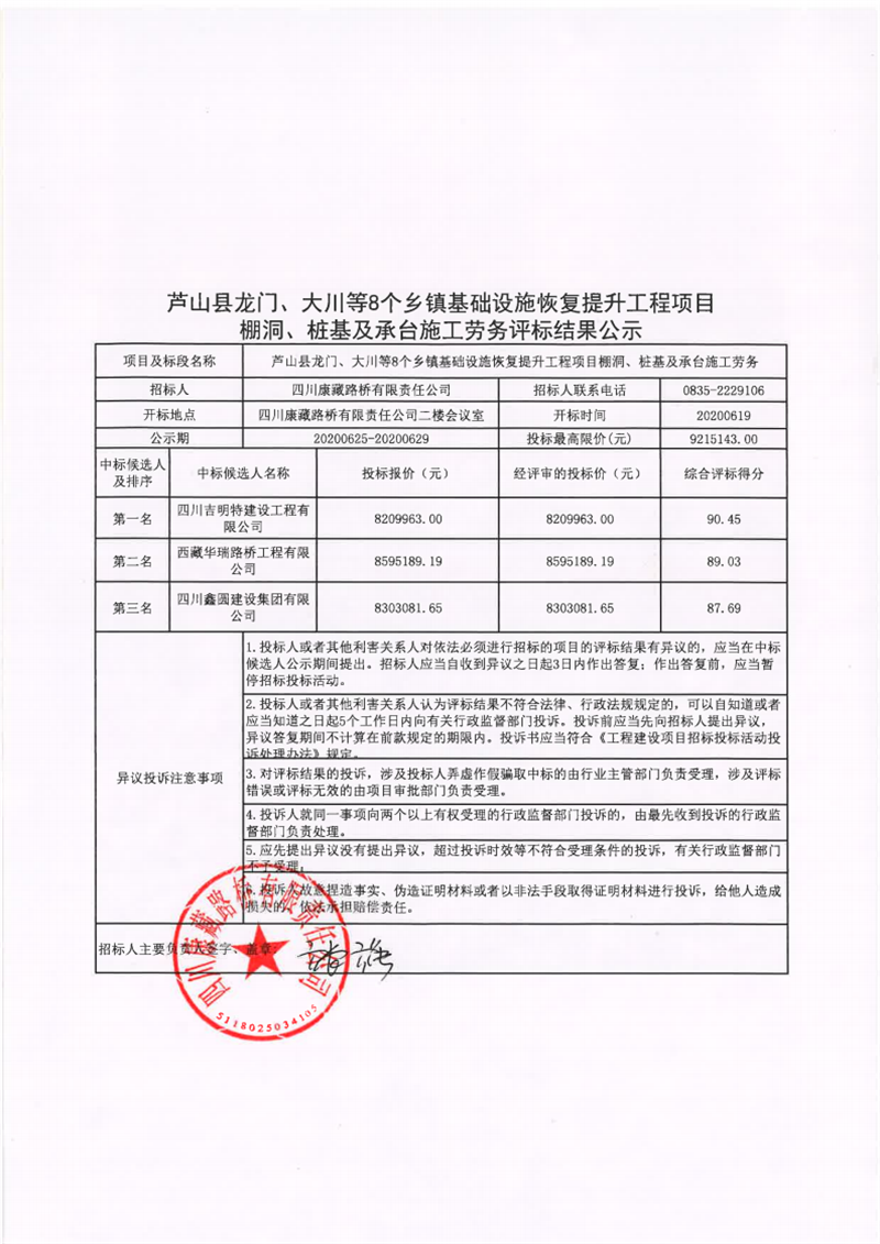 四川康藏路橋有限責(zé)任公司蘆山縣龍門(mén)、大川等8個(gè)鄉(xiāng)鎮(zhèn)基礎(chǔ)設(shè)施恢復(fù)提升工程項(xiàng)目棚洞、樁基及承臺(tái)施工勞務(wù)評(píng)標(biāo)結(jié)果公示