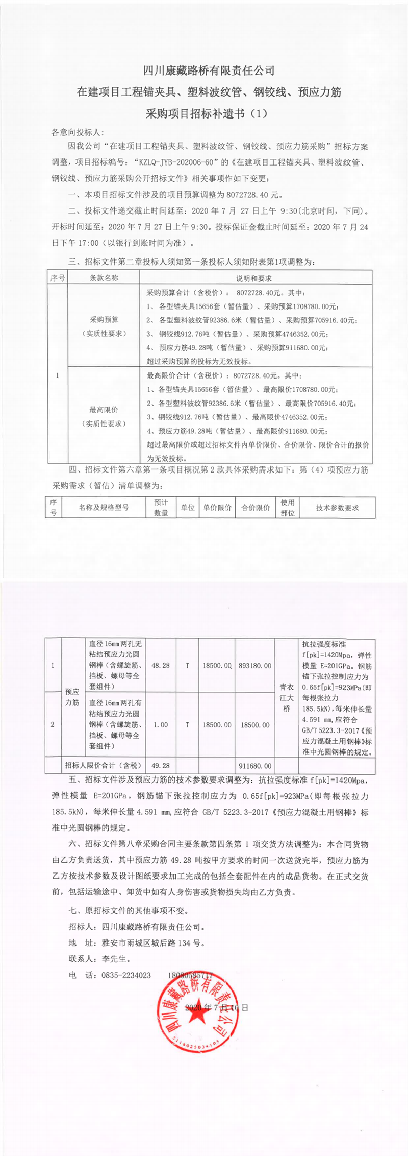 四川康藏路橋有限責(zé)任公司在建項(xiàng)目工程錨夾具、塑料波紋管、鋼鉸線、預(yù)應(yīng)力筋采購(gòu)項(xiàng)目招標(biāo)補(bǔ)遺書(shū)(1)