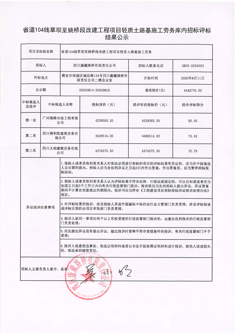 四川康藏路橋有限責(zé)任公司省道104線草壩至姚橋段改建工程項目輕質(zhì)土路基施工勞務(wù)庫內(nèi)招標評標結(jié)果公示