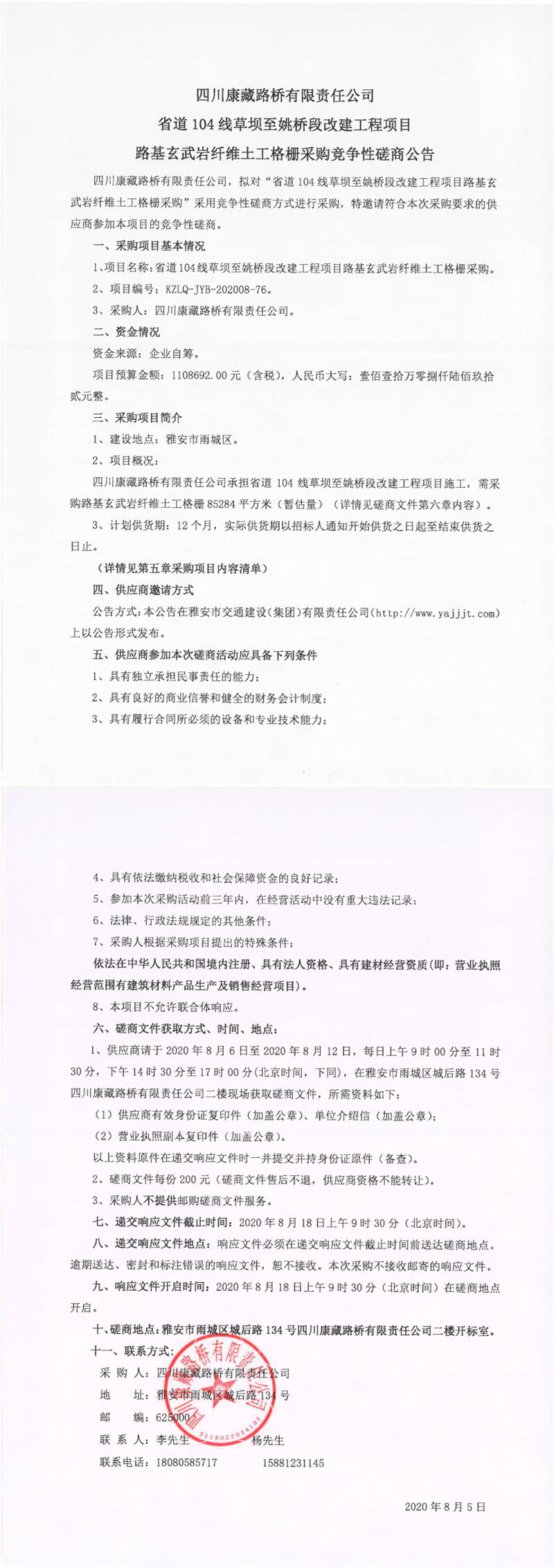 四川康藏路橋有限責(zé)任公司省道104線(xiàn)草壩至姚橋段改建工程項(xiàng)目路基玄武巖纖維土工格柵采購(gòu)競(jìng)爭(zhēng)性磋商公告