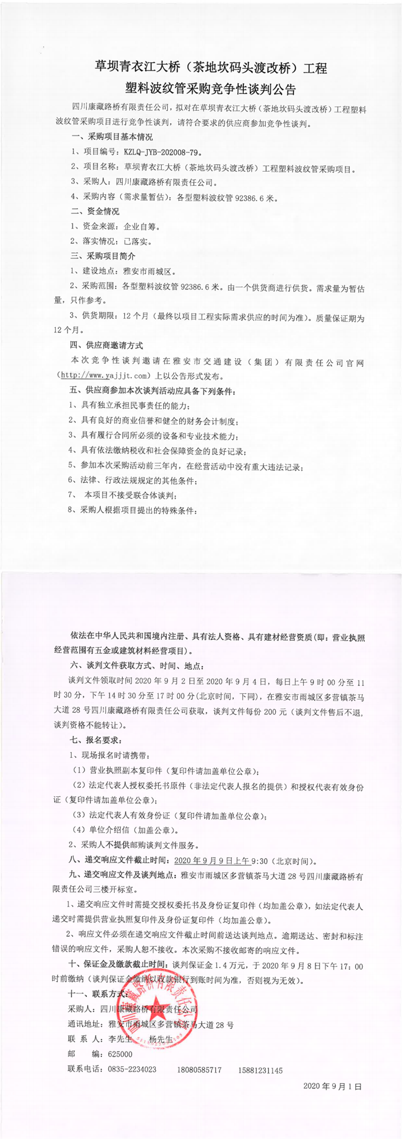 四川康藏路橋有限責(zé)任公司草壩青衣江大橋(茶地坎碼頭渡改橋)工程塑料波紋管采購(gòu)競(jìng)爭(zhēng)性談判公告