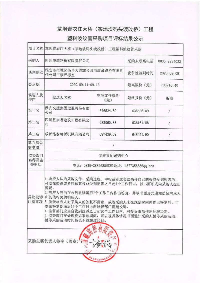 四川康藏路橋有限責任公司草壩青衣江大橋(茶地坎碼頭渡改橋)工程塑料波紋管采購項目評標結果公示