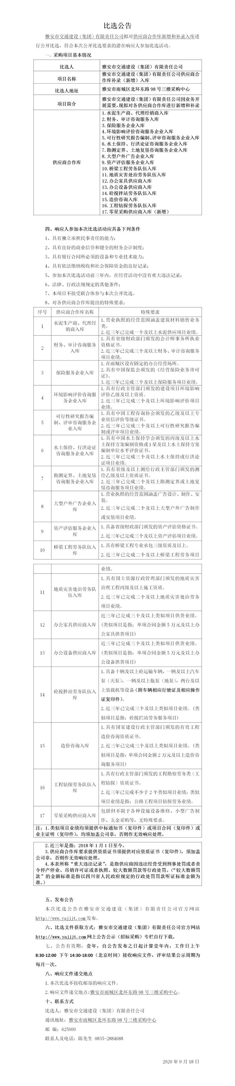 雅安市交通建設(shè)(集團)有限責任公司供應(yīng)商合作庫補錄(新增)入庫比選公告