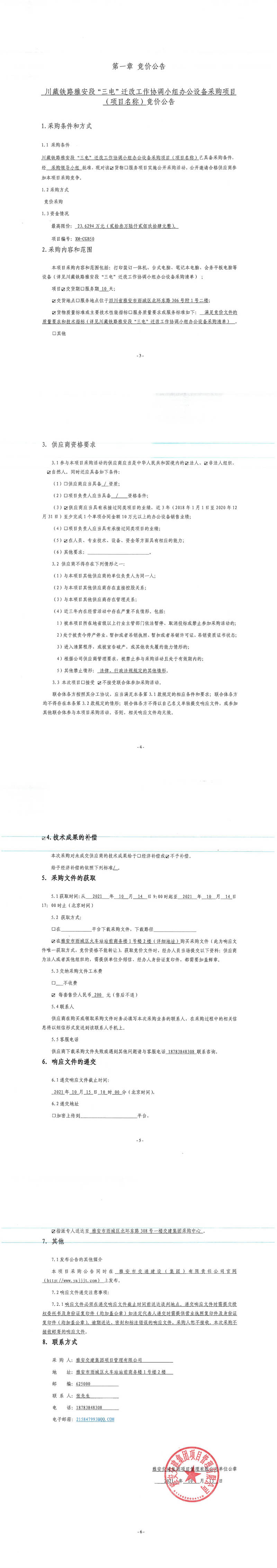雅安交建集團項目管理有限公司川藏鐵路雅安段“三電”遷改工作協(xié)調(diào)小組辦公設(shè)備采購項目競價公告