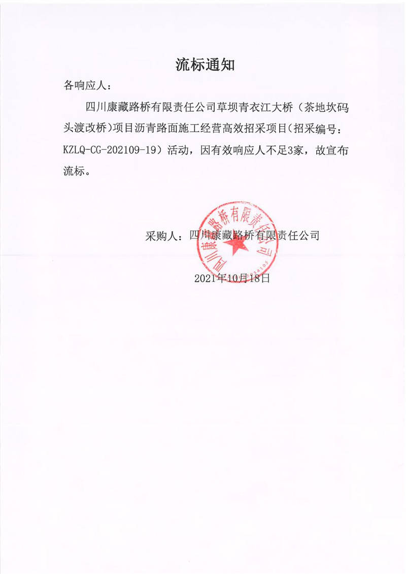 四川康藏路橋有限責(zé)任公司草壩青衣江大橋(茶地坎碼頭渡改橋)項(xiàng)目瀝青路面施工經(jīng)營(yíng)高效招采項(xiàng)目流標(biāo)通知