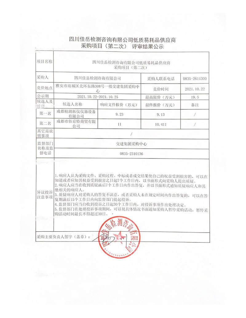 四川佳岳檢測咨詢有限公司低質(zhì)易耗品供應商采購項目(第二次)評審結果公示