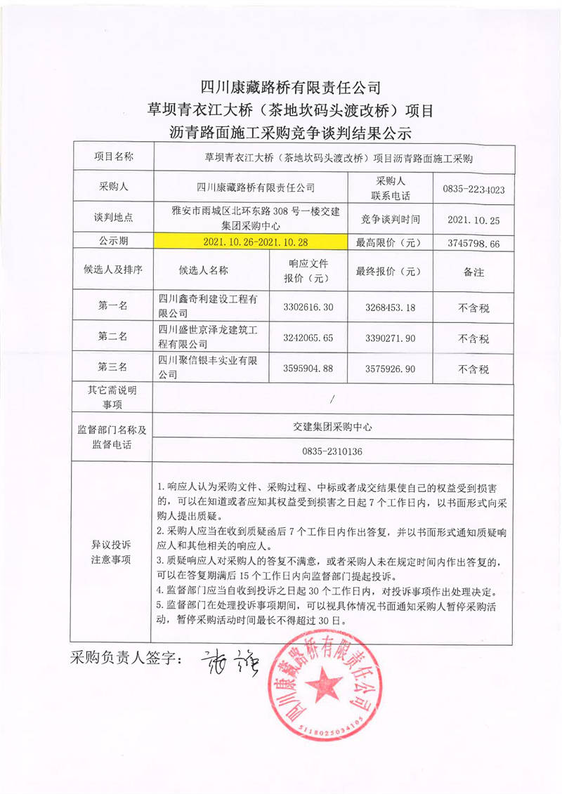 四川康藏路橋有限責(zé)任公司草壩青衣江大橋(茶地坎碼頭渡改橋)項(xiàng)目瀝青路面施工采購競(jìng)爭(zhēng)談判結(jié)果公示
