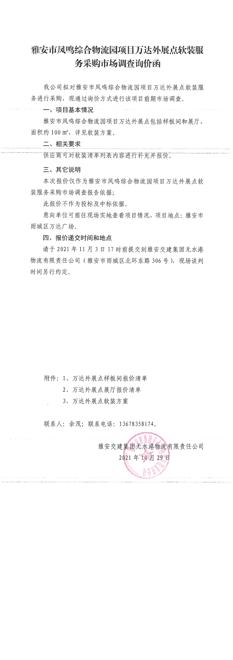 雅安交建集團(tuán)無(wú)水港物流有限責(zé)任公司雅安市鳳鳴綜合物流園項(xiàng)目萬(wàn)達(dá)外展點(diǎn)軟裝服務(wù)采購(gòu)市場(chǎng)調(diào)查詢(xún)價(jià)函