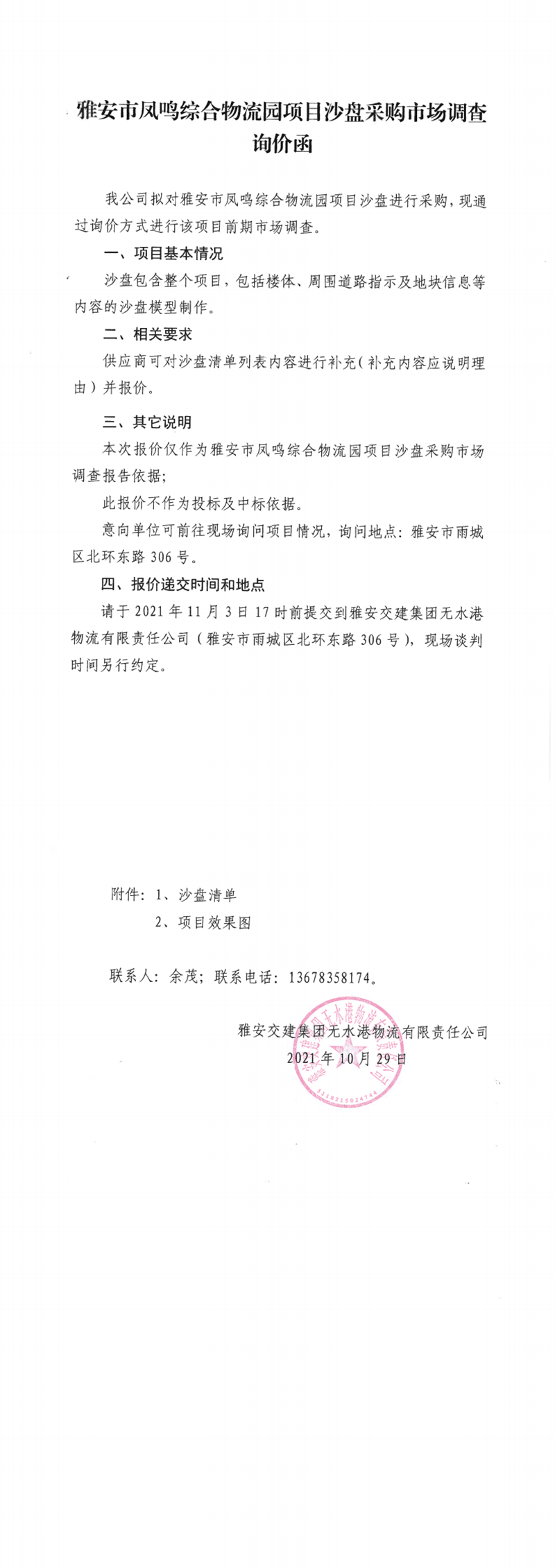 雅安交建集團無水港物流有限責任公司雅安市鳳鳴綜合物流園項目沙盤采購市場調查詢價函