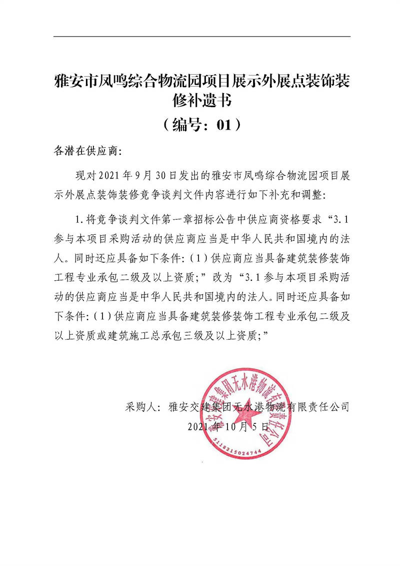 雅安交建集團(tuán)無(wú)水港物流有限責(zé)任公司雅安市鳳鳴綜合物流園項(xiàng)目展示外展點(diǎn)裝飾裝修補(bǔ)遺書