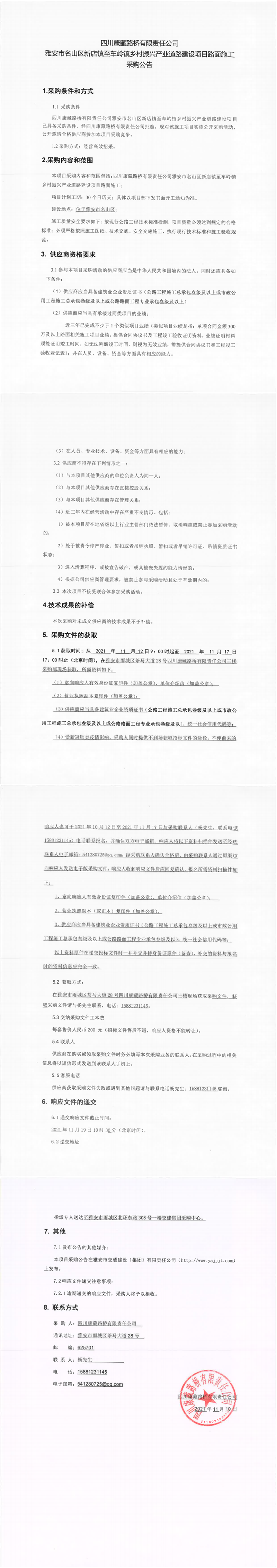 四川康藏路橋有限責任公司雅安市名山區(qū)新店鎮(zhèn)至車嶺鎮(zhèn)鄉(xiāng)村振興產(chǎn)業(yè)道路建設項目路面施工采購公告
