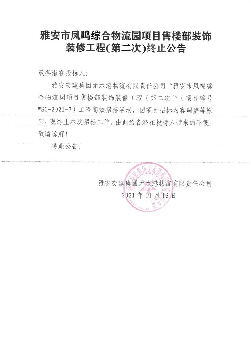 雅安交建集團無水港物流有限責(zé)任公司雅安市鳳鳴綜合物流園項目售樓部裝飾裝修工程(第二次)終止公告