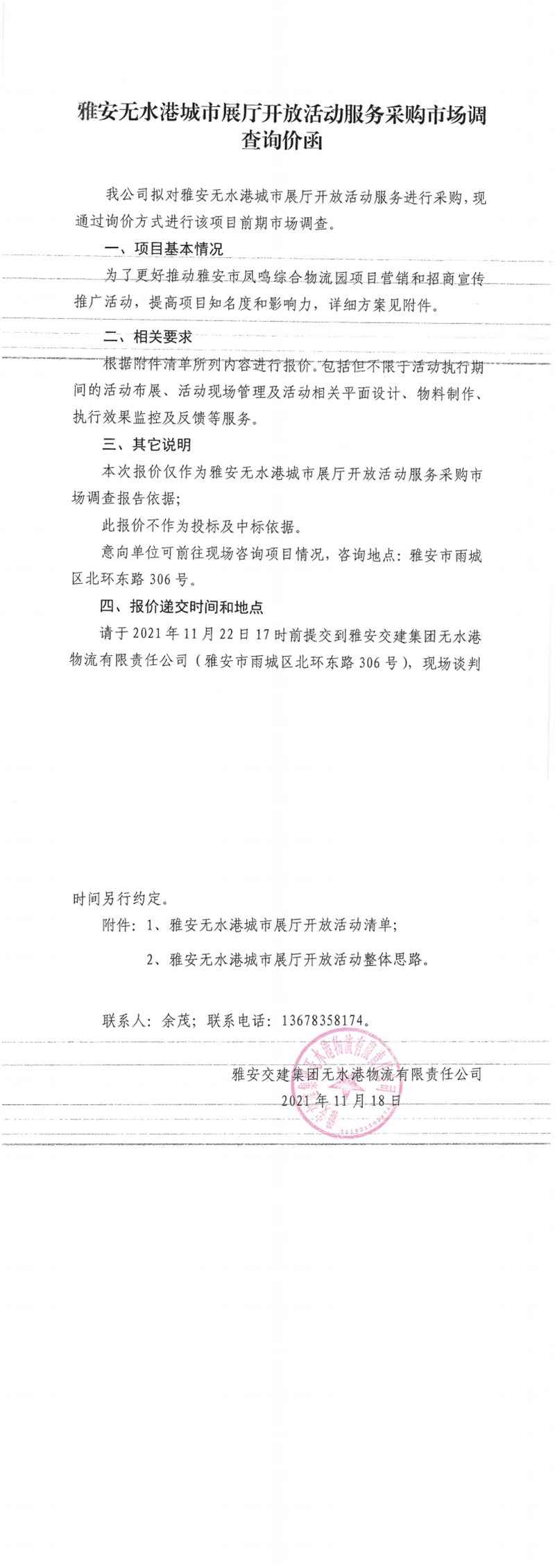 雅安交建集團(tuán)無(wú)水港物流有限責(zé)任公司雅安無(wú)水港城市展廳開(kāi)放活動(dòng)服務(wù)采購(gòu)市場(chǎng)調(diào)查詢價(jià)函