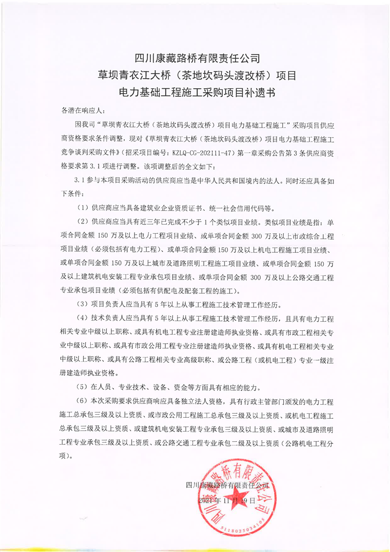 四川康藏路橋有限責任公司草壩青衣江大橋(茶地坎碼頭渡改橋)項目電力基礎(chǔ)工程施工采購項目補遺書