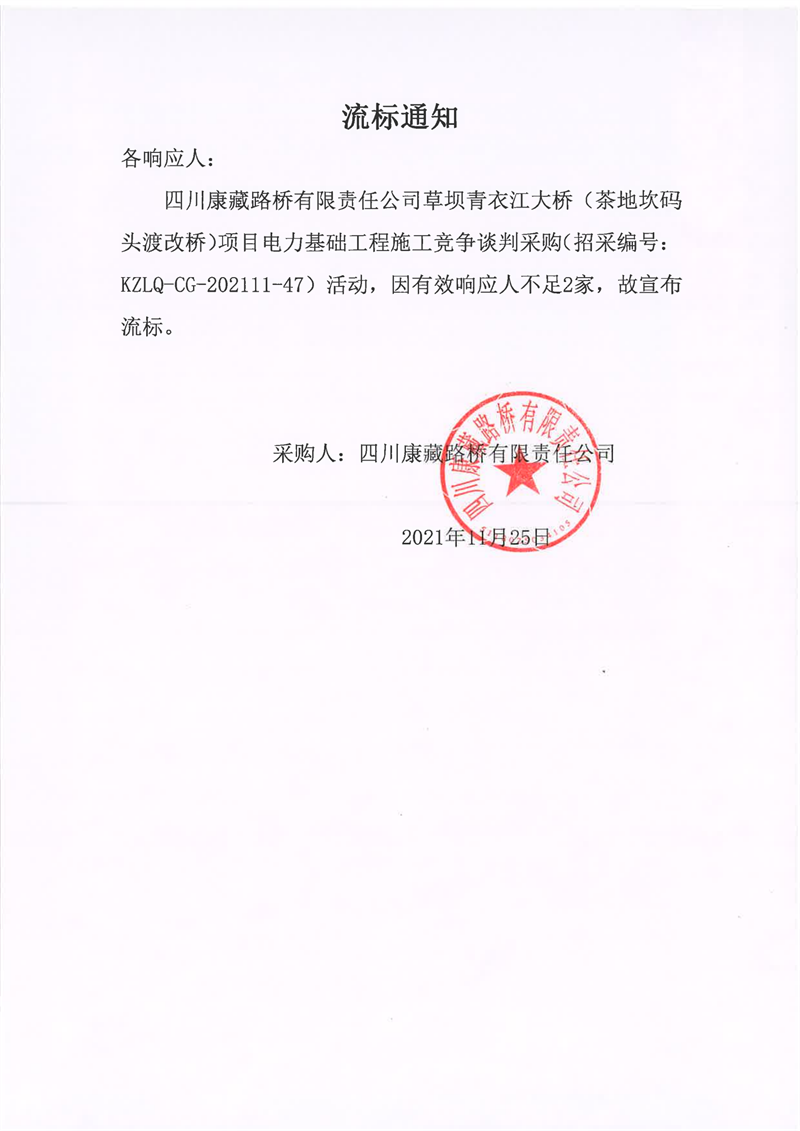 四川康藏路橋有限責(zé)任公司草壩青衣江大橋(茶地坎碼頭渡改橋)項(xiàng)目電力基礎(chǔ)工程施工競(jìng)爭(zhēng)談判采購流標(biāo)通知