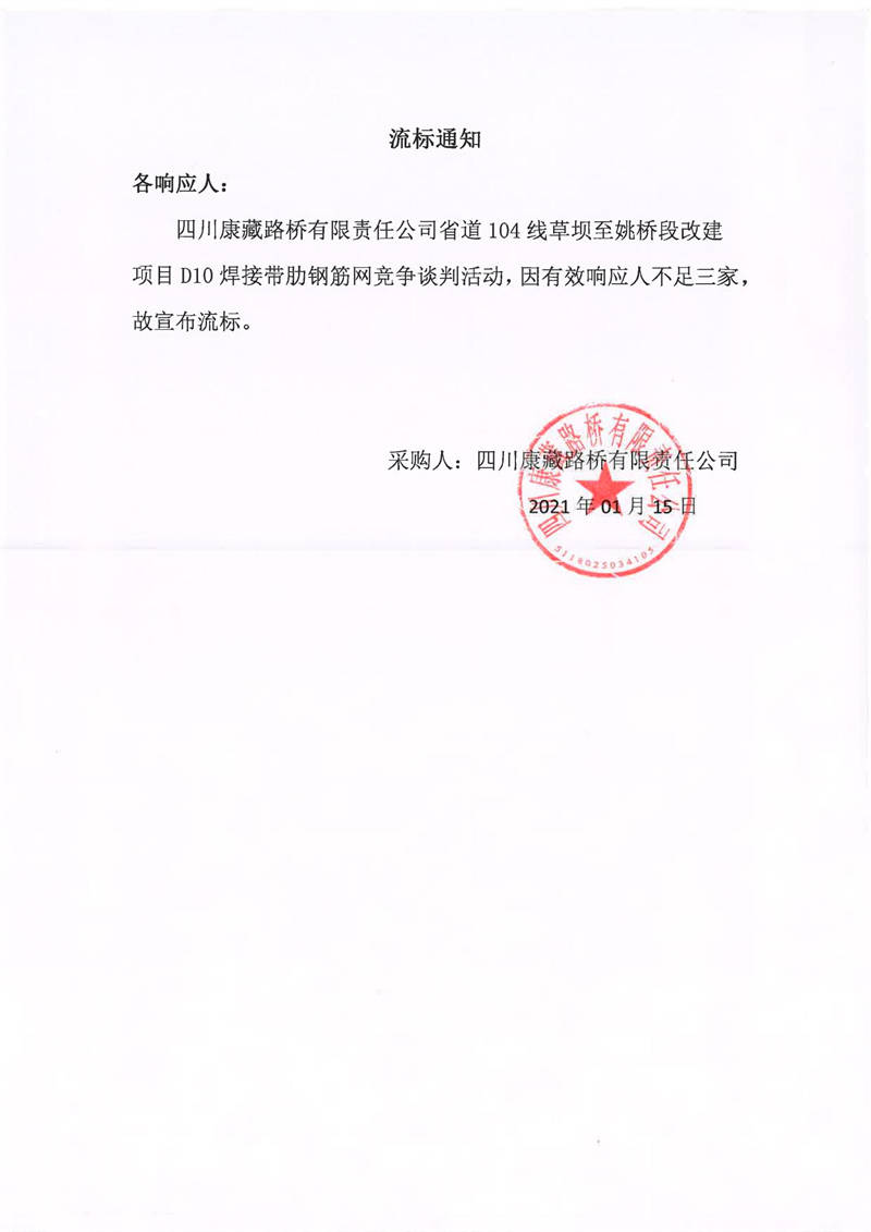 四川康藏路橋有限責(zé)任公司省道104線草壩至姚橋段改建項目D10焊接帶肋鋼筋網(wǎng)采購項目流標(biāo)通知