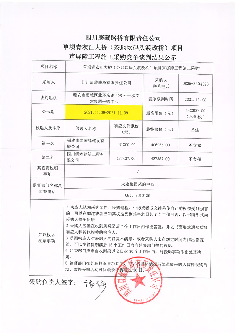 四川康藏路橋有限責(zé)任公司草壩青衣江大橋(茶地坎碼頭渡改橋)項(xiàng)目聲屏障工程施工采購競(jìng)爭談判結(jié)果公示