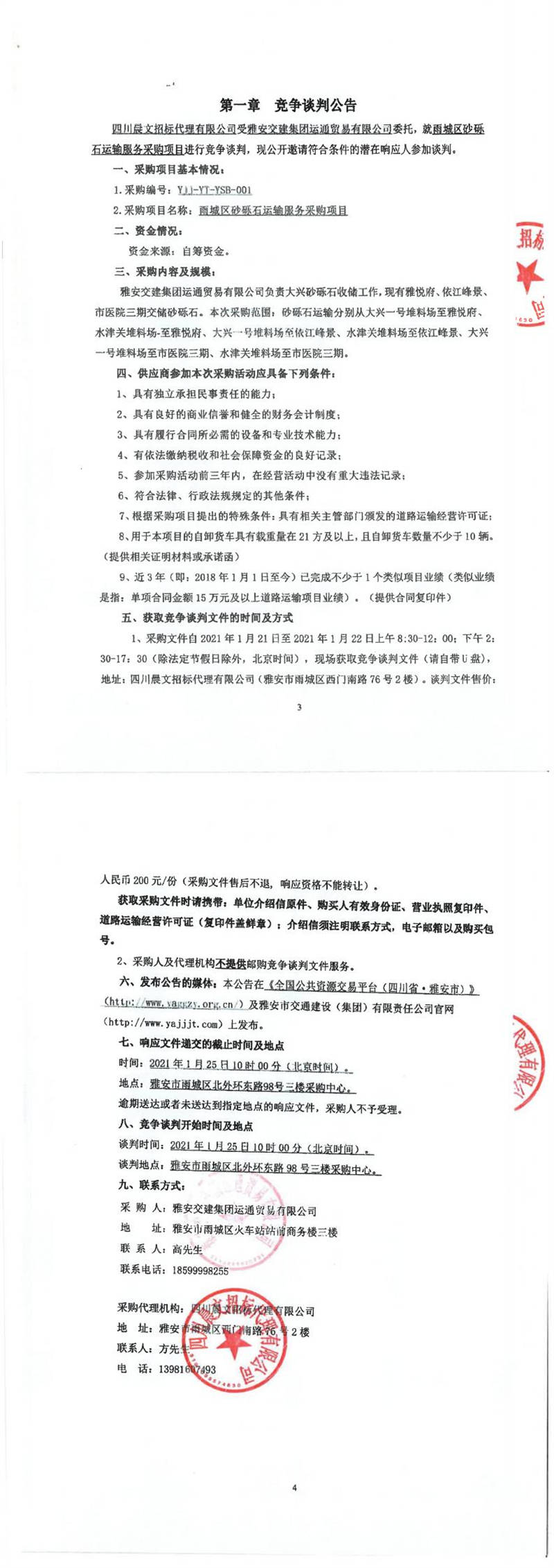 雅安交建集團(tuán)運通貿(mào)易有限公司雨城區(qū)砂礫石運輸服務(wù)采購項目競爭談判公告