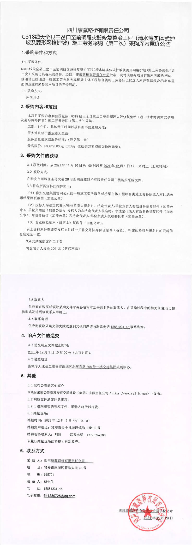 四川康藏路橋有限責任公司G318線天全縣三岔口至前碉段災毀修復整治工程(清水灣實體式護坡及菱形網格護坡)施工勞務采購(第二次)采購庫內競價公告