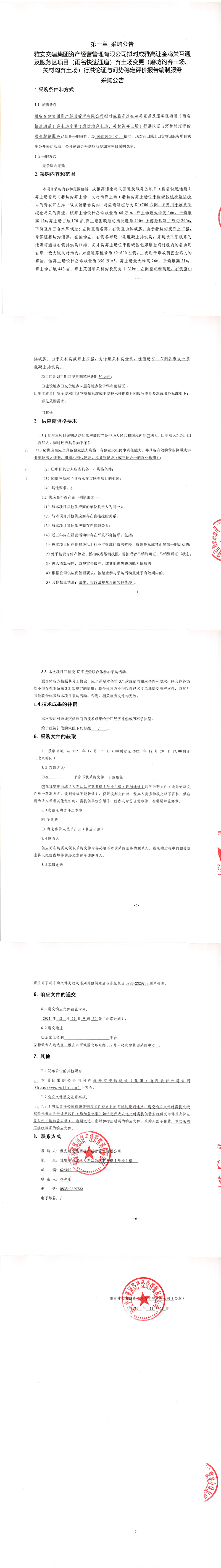 雅安交建集團(tuán)資產(chǎn)經(jīng)營管理有限公司擬對成雅高速金雞關(guān)互通及服務(wù)區(qū)項(xiàng)目(雨名快速通道)棄土場變更(磨坊溝棄土場、關(guān)材溝棄土場)行洪論證與河勢穩(wěn)定評價(jià)報(bào)告編制服務(wù)采購公告