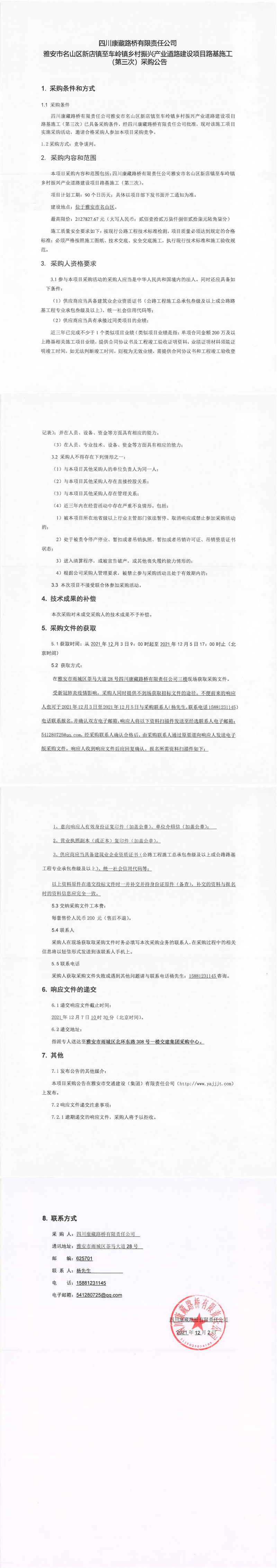 四川康藏路橋有限責任公司雅安市名山區(qū)新店鎮(zhèn)至車嶺鎮(zhèn)鄉(xiāng)村振興產(chǎn)業(yè)道路建設項目路基施工(第三次)采購公告