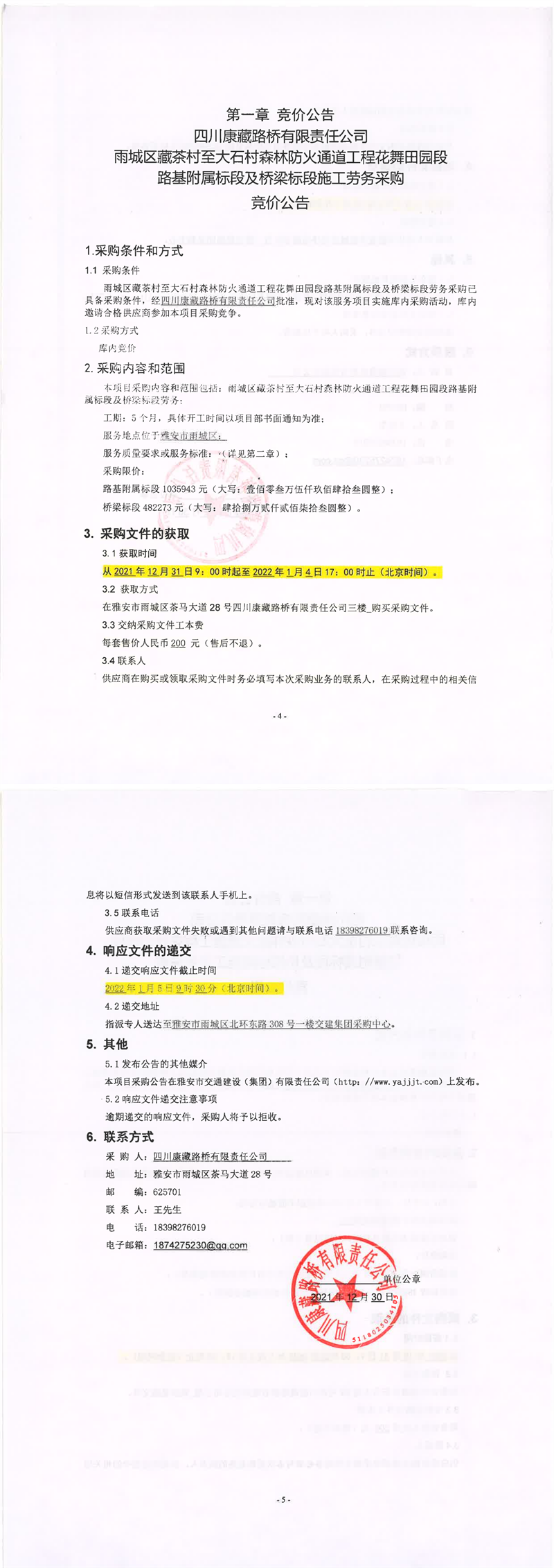 四川康藏路橋有限責(zé)任公司雨城區(qū)藏茶村至大石村森林防火通道工程花舞田園段路基附屬標段及橋梁標段施工勞務(wù)采購競價公告