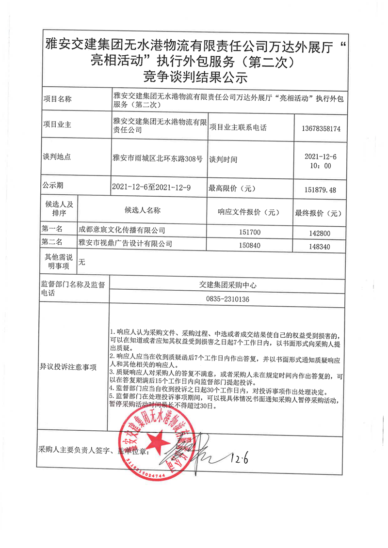 雅安交建集團(tuán)無水港物流有限責(zé)任公司萬達(dá)外展廳“亮相活動”執(zhí)行外包服務(wù)(第二次)競爭談判結(jié)果公示