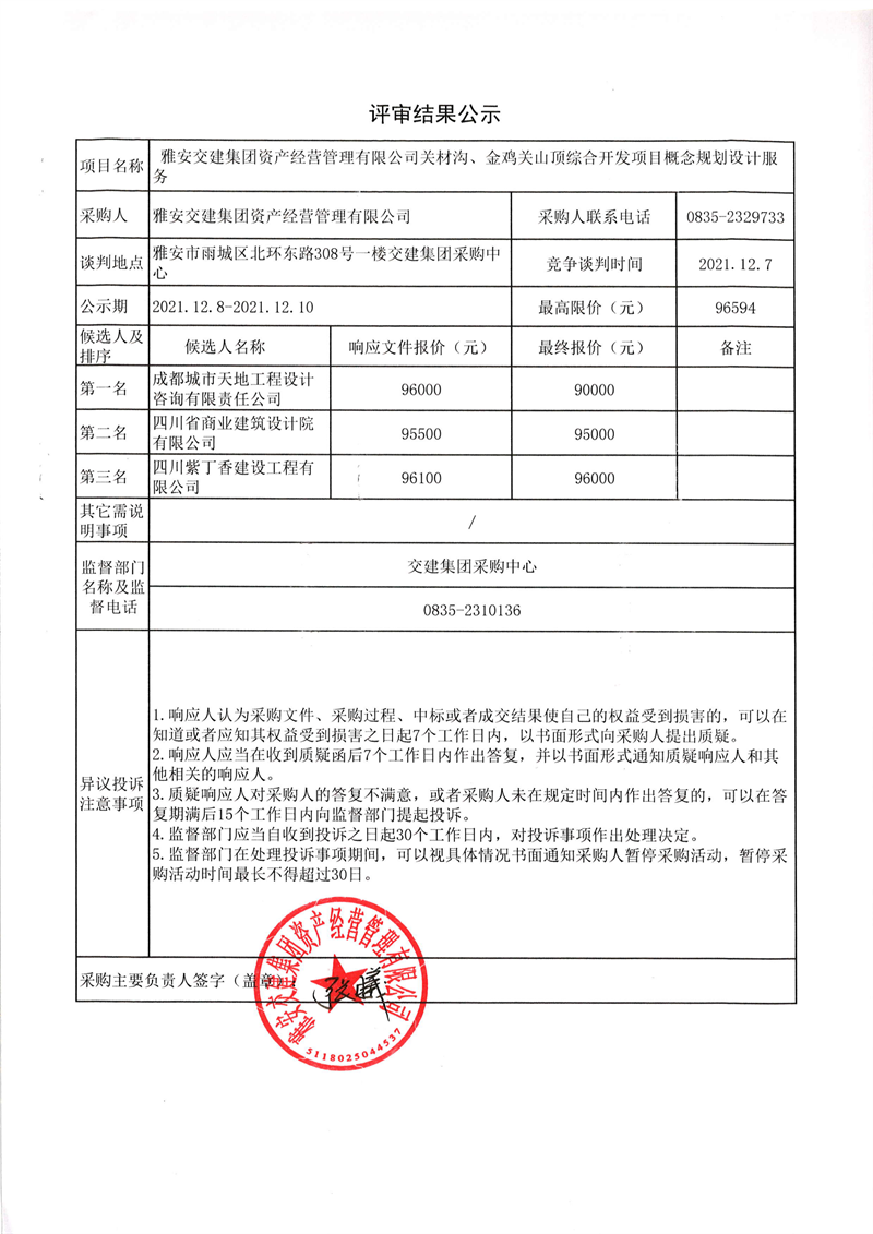 雅安交建集團(tuán)資產(chǎn)經(jīng)營管理有限公司關(guān)材溝、金雞關(guān)山頂綜合開發(fā)項(xiàng)目概念規(guī)劃設(shè)計(jì)服務(wù)評審結(jié)果公示