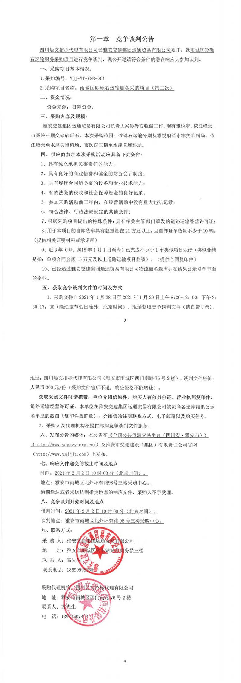 雅安交建集團(tuán)運通貿(mào)易有限公司雨城區(qū)砂礫石運輸服務(wù)采購項目(第二次)競爭談判公告