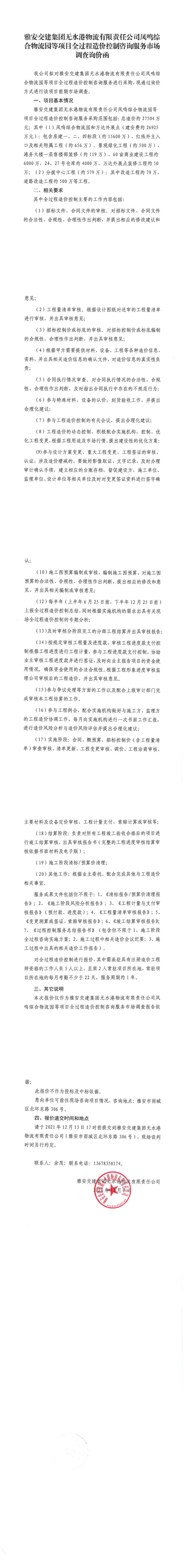 雅安交建集團(tuán)無水港物流有限責(zé)任公司鳳鳴綜合物流園等項(xiàng)目全過程造價控制咨詢服務(wù)市場調(diào)查詢價函