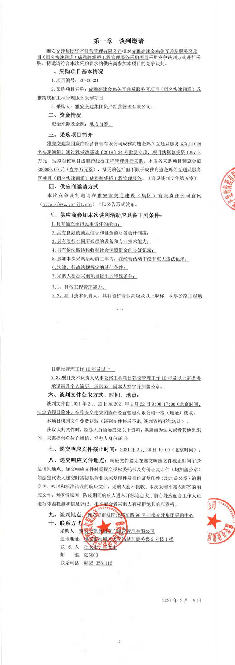 雅安交建集團(tuán)資產(chǎn)經(jīng)營管理有限公司成雅高速金雞關(guān)互通及服務(wù)區(qū)項(xiàng)目(雨名快速通道)成雅跨線橋工程管理服務(wù)采購項(xiàng)目競爭談判公告