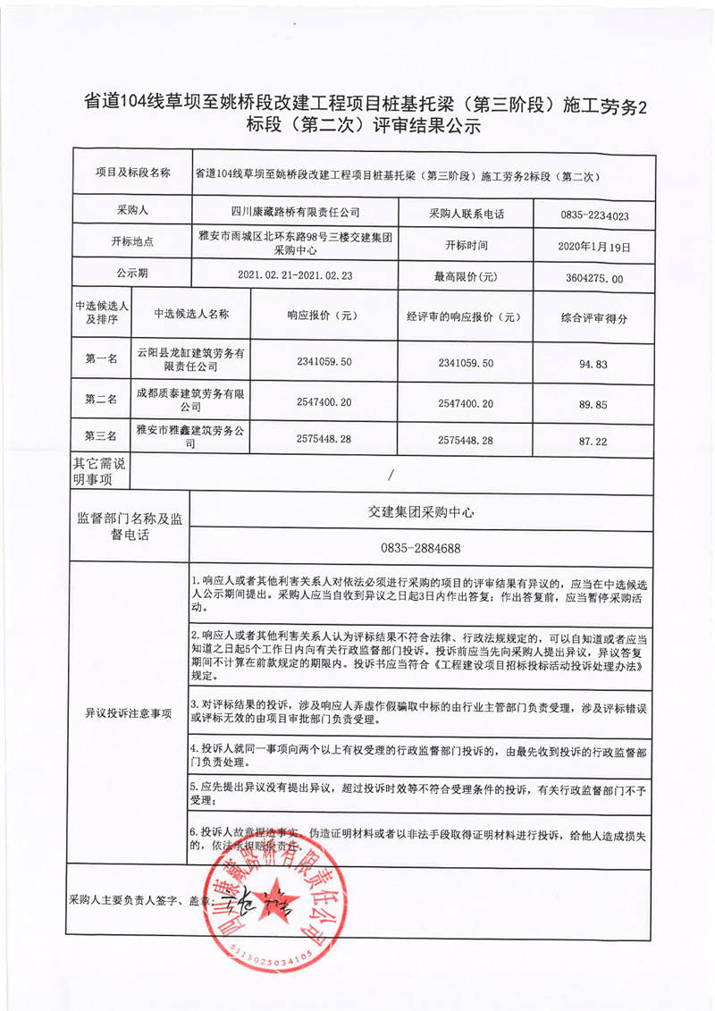 四川康藏路橋有限責(zé)任公司省道104線草壩至姚橋段改建工程項目樁基托梁(第三階段)施工勞務(wù)2標(biāo)段(第二次)評審結(jié)果公示
