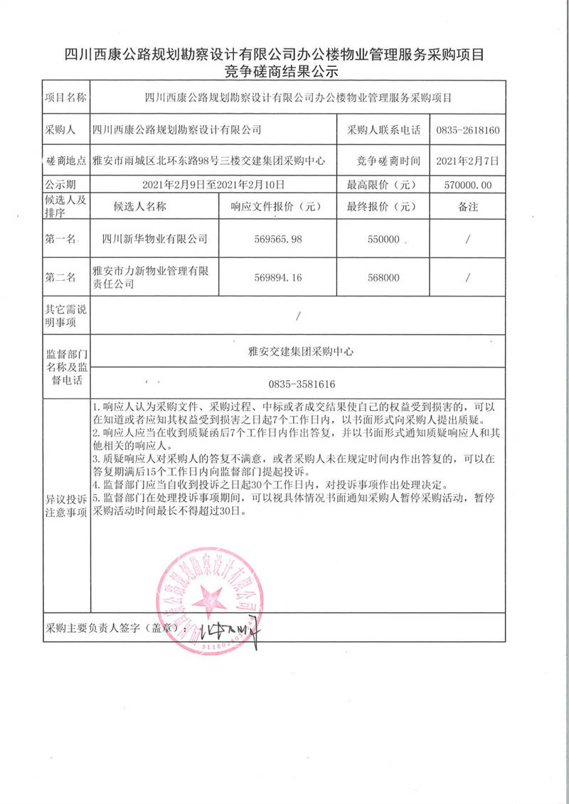 四川西康公路規(guī)劃勘察設計有限公司辦公樓物業(yè)管理服務采購項目競爭磋商結(jié)果公示