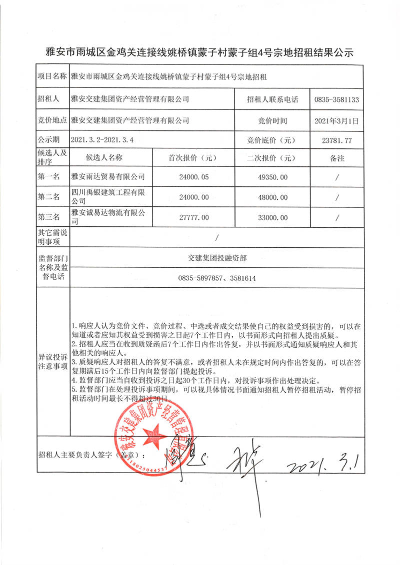 雅安交建集團資產經營管理有限公司雅安市雨城區(qū)金雞關連接線姚橋鎮(zhèn)蒙子村蒙子組4號宗地招租結果公示