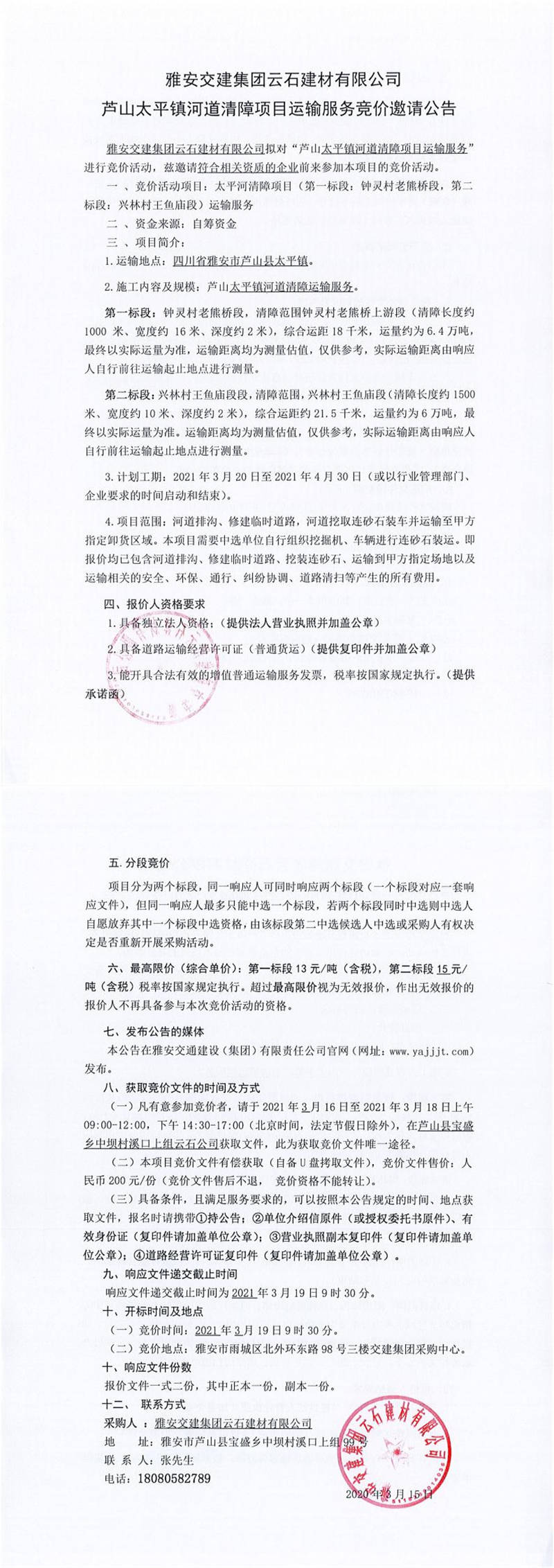 雅安交建集團云石建材有限公司蘆山太平鎮(zhèn)河道清障項目運輸服務競價邀請公告