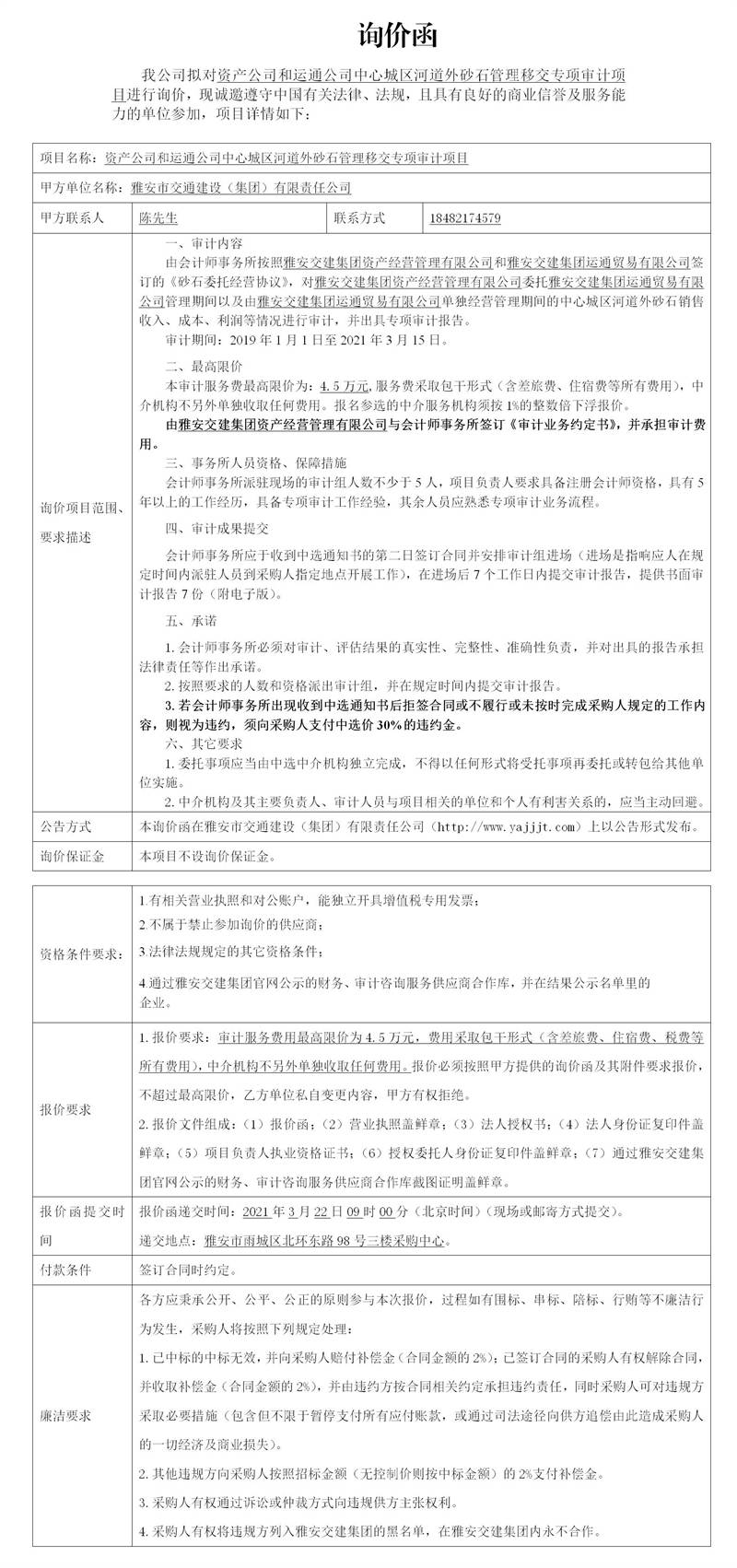 雅安市交通建設(shè)(集團(tuán))有限責(zé)任公司資產(chǎn)公司和運通公司中心城區(qū)河道外砂石管理移交專項審計項目詢價函