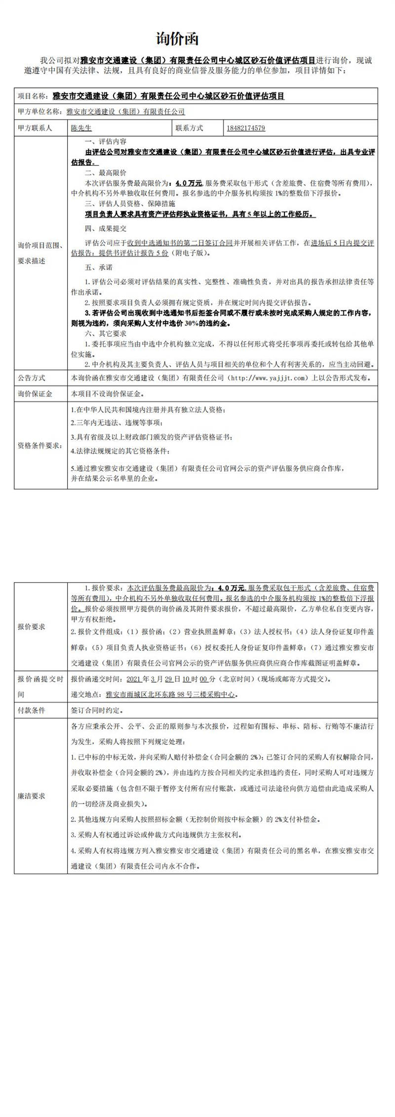 雅安市交通建設(集團)有限責任公司中心城區(qū)砂石價值評估項目詢價函