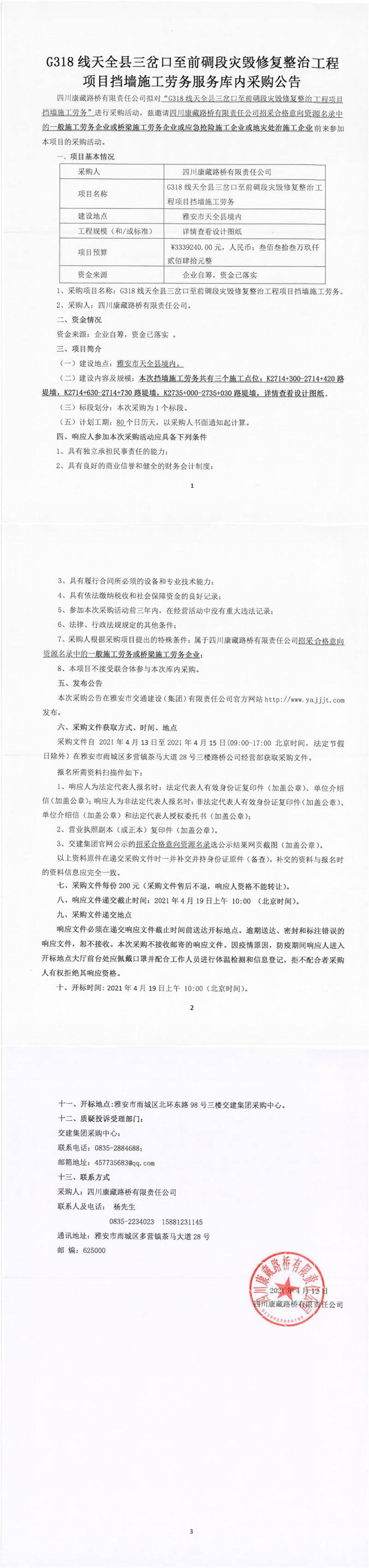 四川康藏路橋有限責(zé)任公司G318線(xiàn)天全縣三岔口至前碉段災(zāi)毀修復(fù)整治工程項(xiàng)目擋墻施工勞務(wù)服務(wù)庫(kù)內(nèi)采購(gòu)公告