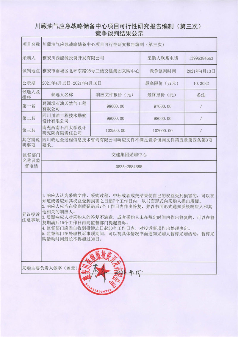 雅安川西能源投資開發(fā)有限公司川藏油氣應急戰(zhàn)略儲備中心項目可行性研究報告編制 (第三次)競爭談判結果公示
