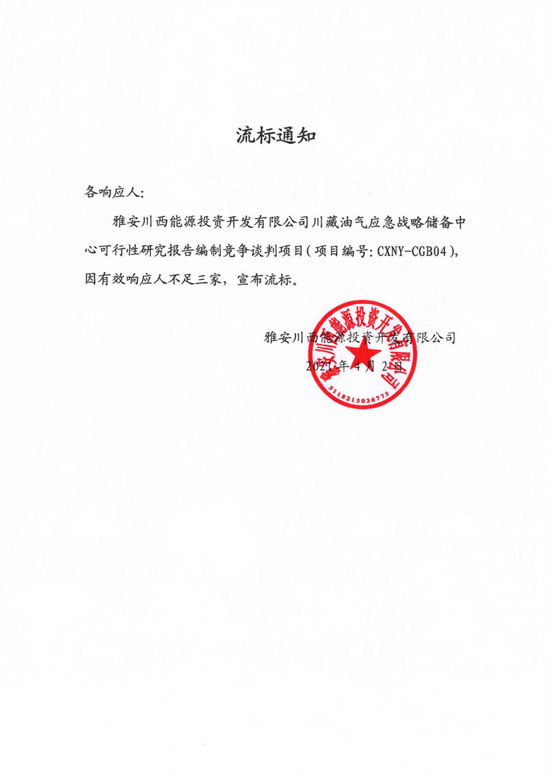 雅安川西能源投資開發(fā)有限公司川藏油氣應(yīng)急戰(zhàn)略儲(chǔ)備中心可行性研究報(bào)告編制競爭談判項(xiàng)目流標(biāo)通知
