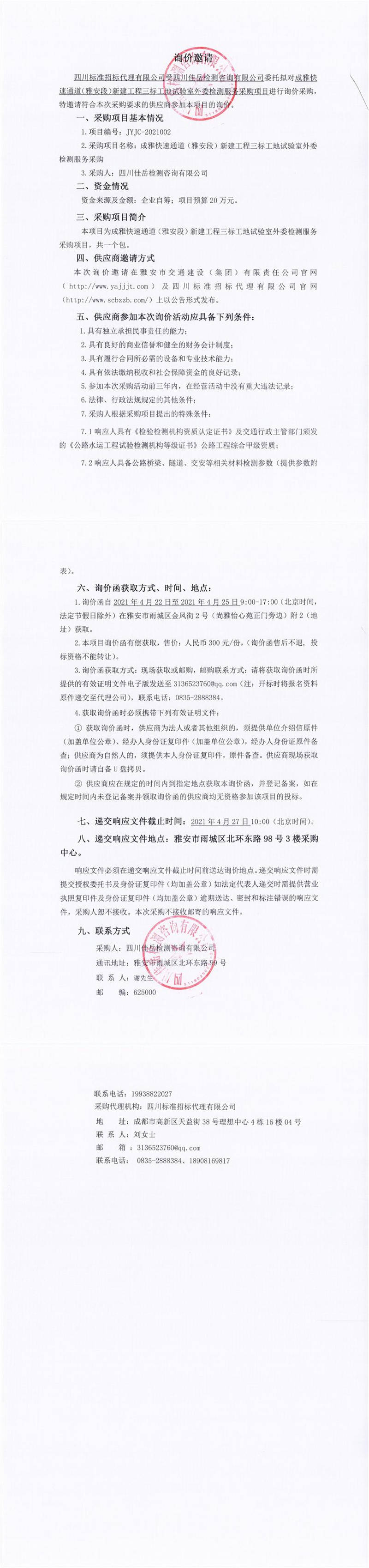 四川佳岳檢測(cè)咨詢有限公司成雅快速通道(雅安段)新建工程三標(biāo)工地試驗(yàn)室外委檢測(cè)服務(wù)采購詢價(jià)公告