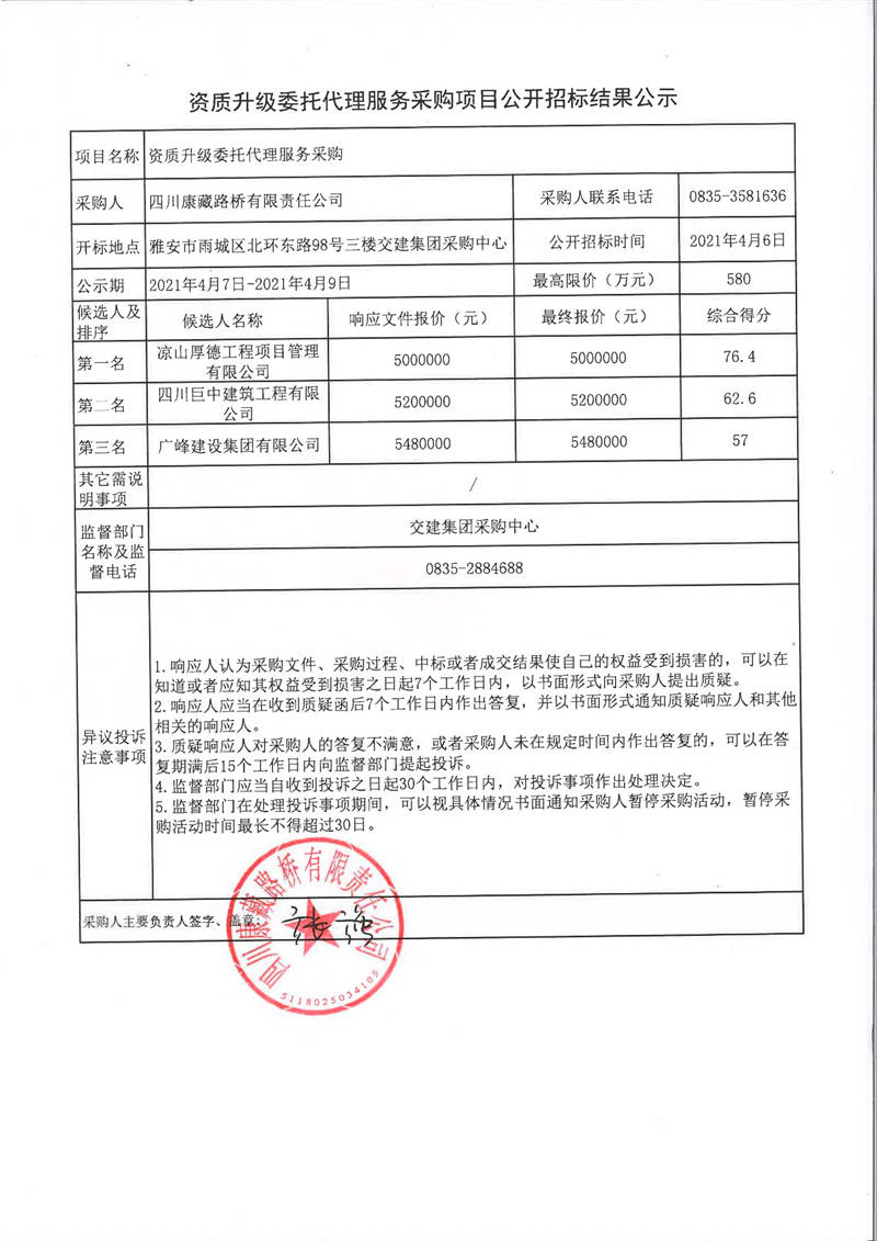四川康藏路橋有限責任公司資質(zhì)升級委托代理服務采購項目公開招標結(jié)果公示
