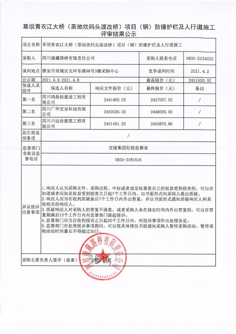 四川康藏路橋有限責任公司草壩青衣江大橋(茶地坎碼頭渡改橋)項目(鋼)防撞護欄及人行道施工評審結果公示